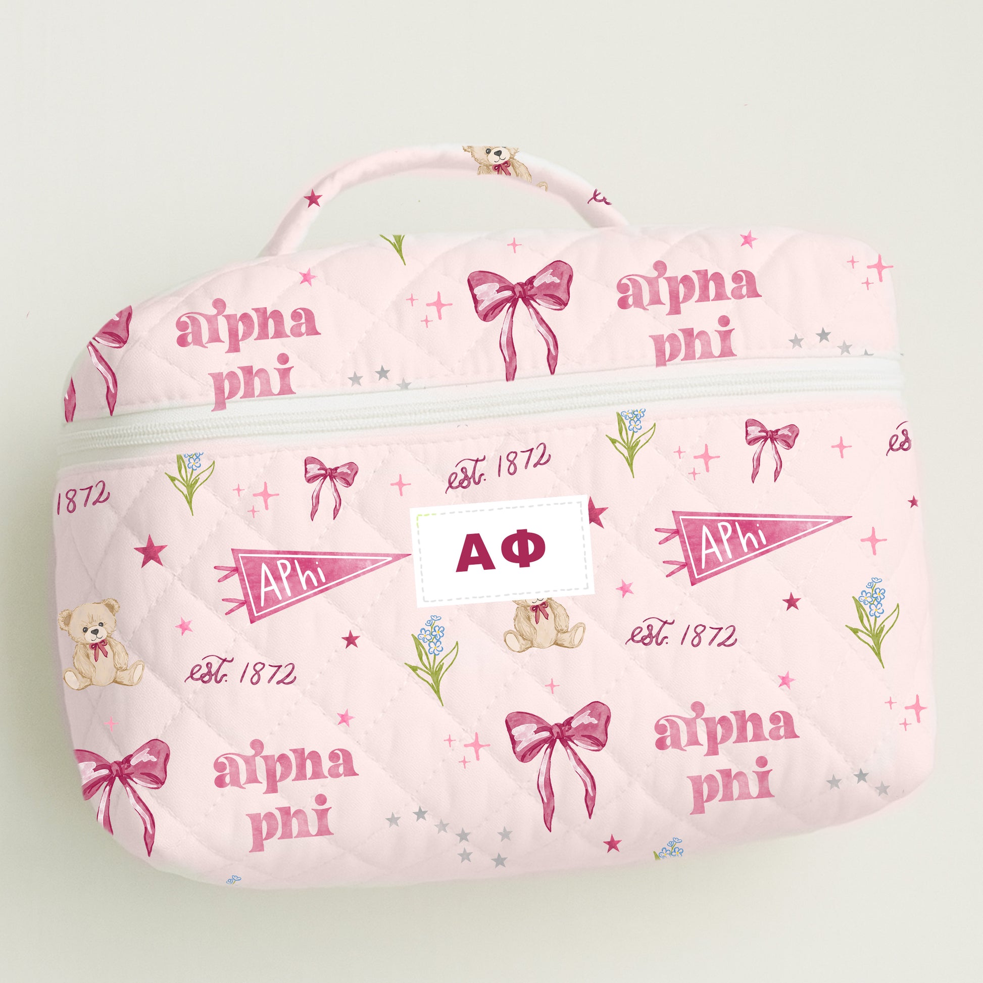 This 10x7x6 inch make up bag designed with sisterhood in mind! This adorable sorority makeup bag is the perfect blend of style and meaning. Featuring your sorority’s unique symbols and signature details, every element is thoughtfully chosen to celebrate what makes your chapter special. The iconic Greek letters are prominently displayed on the front, creating a bold yet elegant statement of pride and belonging. Compact yet spacious enough for everyday essentials, this bag is ideal for campus life, travel, or getting ready with your sisters. It’s more than just a makeup bag. It’s a keepsake that represents your bond, your memories, and your lifelong connection.