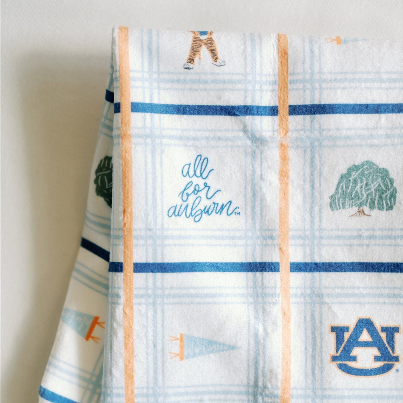 Bring Auburn spirit into your kitchen with this beautifully designed tea towel featuring Melissa’s original watercolor illustrations. The classic blue and orange plaid is sprinkled with iconic Auburn details — Aubie, Samford Hall, the famous Toomer’s oaks, a spirited pennant, and the phrase “All for Auburn.” Made from soft, absorbent cotton, it’s perfect for game day hosting, everyday use, or gifting to any Auburn fan.