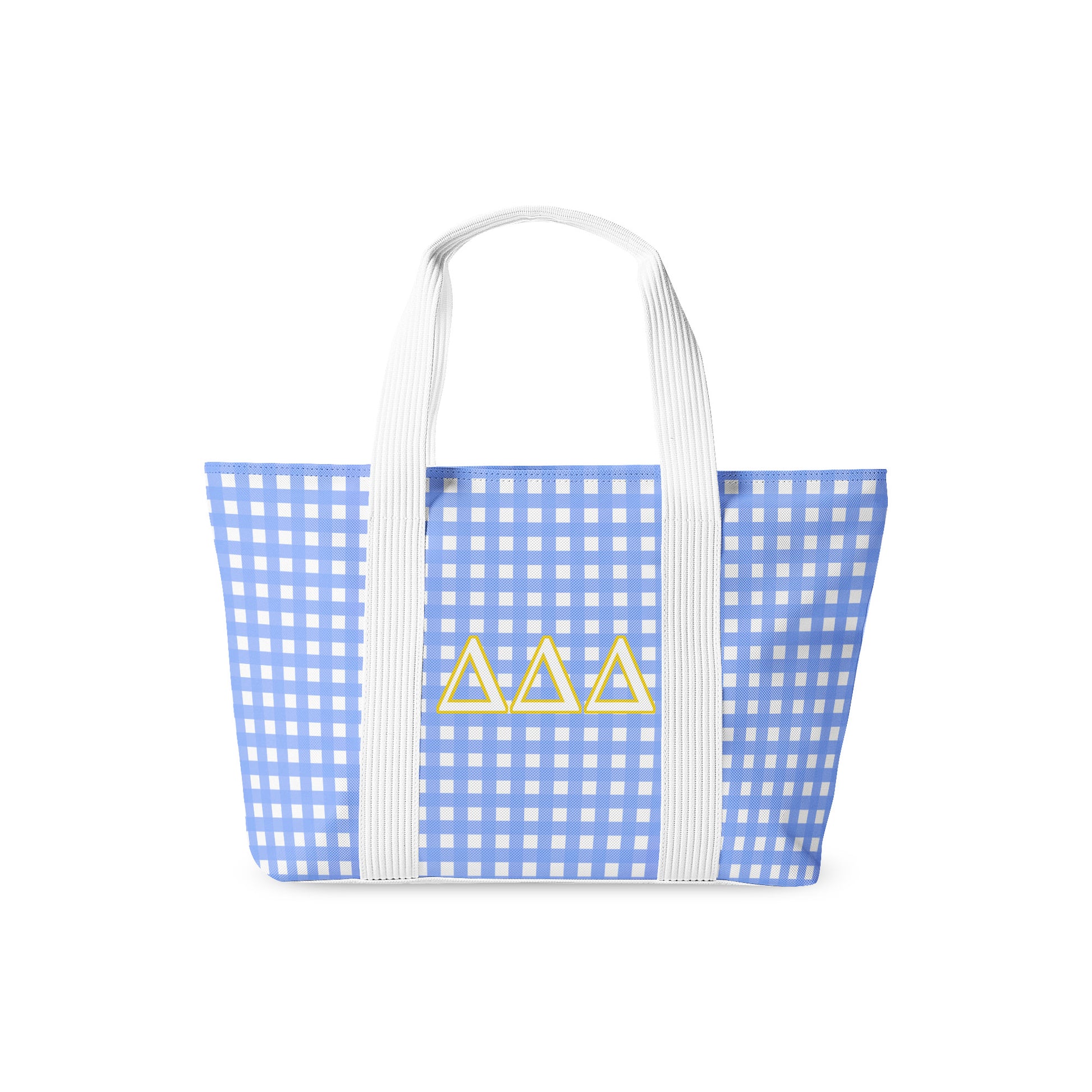 This officially licensed Tri Delta tote bag is both stylish and functional — perfect for campus days, sorority events, or weekend trips. The design features a light blue gingham pattern with the iconic yellow Tri Delta triangles on the front, giving it a fresh, collegiate look. Made from durable canvas with sturdy white straps and a cheerful yellow interior, it’s roomy enough for all your essentials while still keeping that polished, preppy aesthetic Tri Delta girls love.