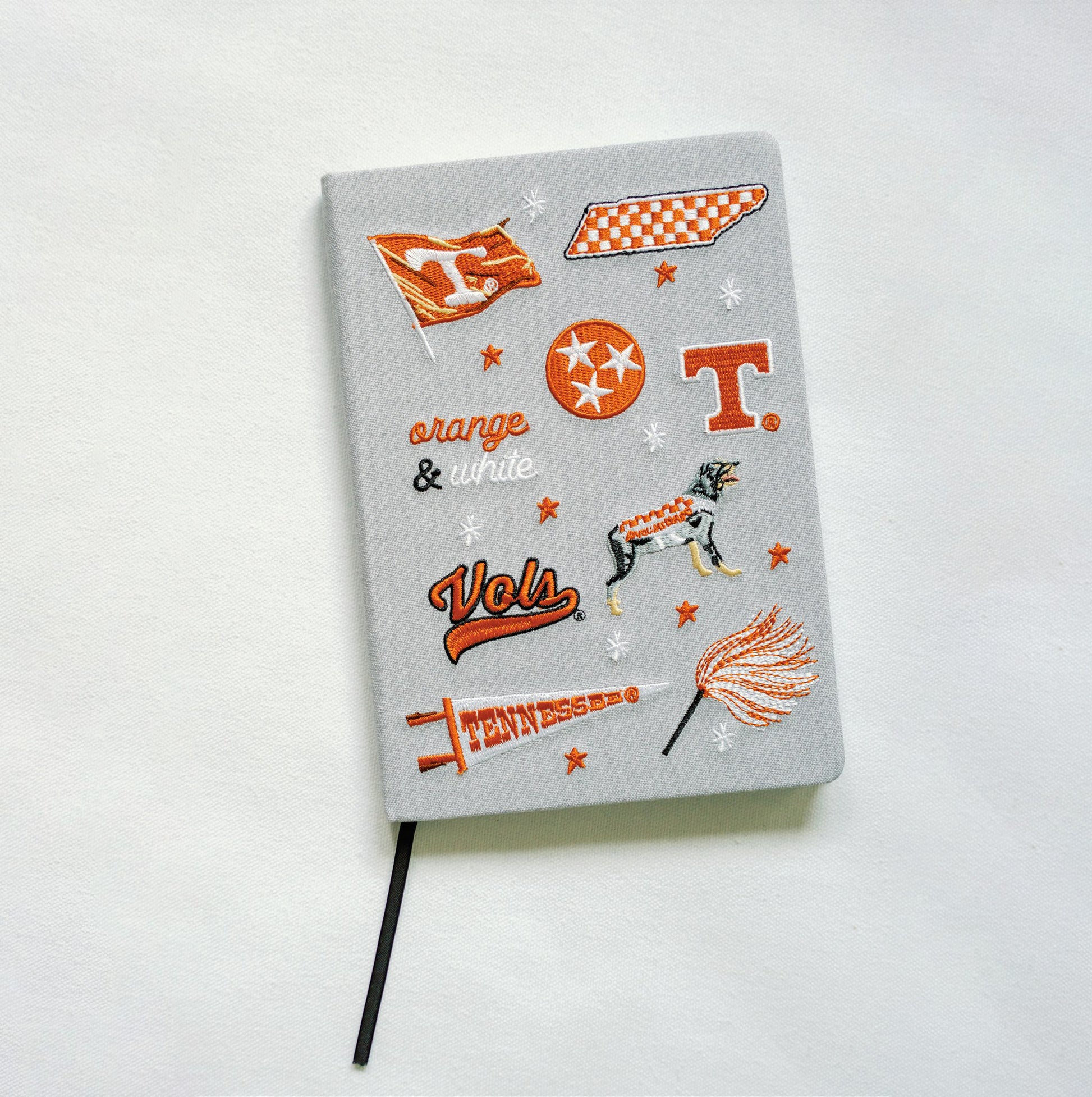 This 5.5x8 inch linen hardcover journal features embroidered icons representing UT traditions! Smokey the mascot, the logo, a shaker, and more are beautifully embroidered onto the navy linen cover.