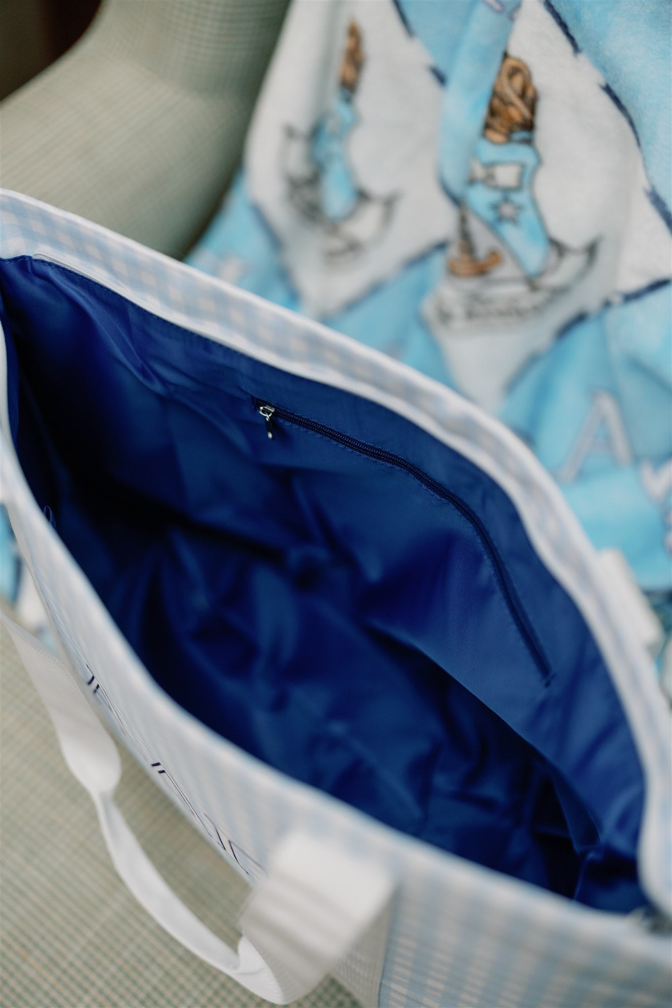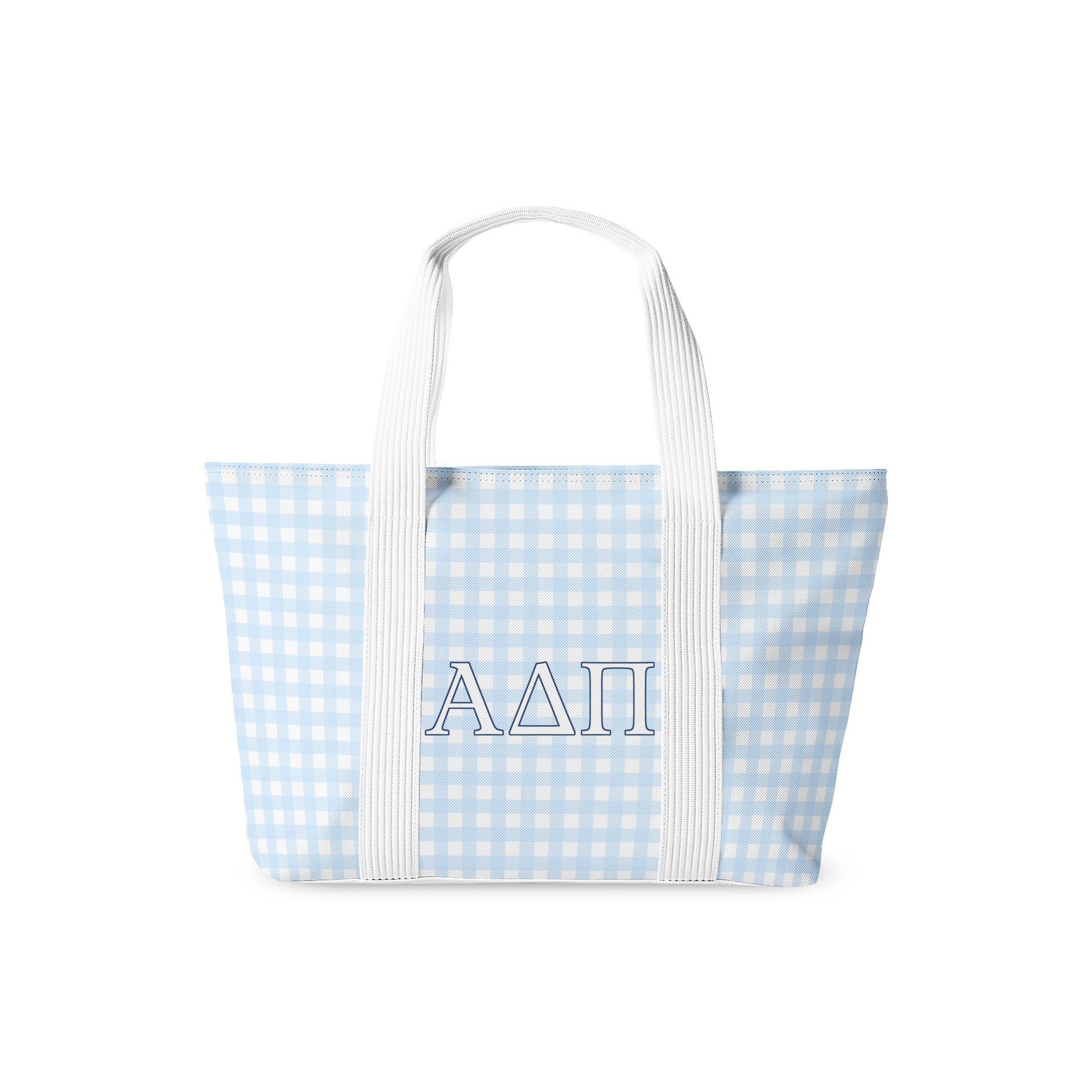 Our Alpha Delta Pi tote bag is a fresh and fun essential for any sister on the go! Designed with a soft blue gingham pattern and crisp embroidered Greek letters, it’s both stylish and spacious. With three interior pockets, it’s perfect for keeping everything from your planner to your lip gloss organized and easy to find.