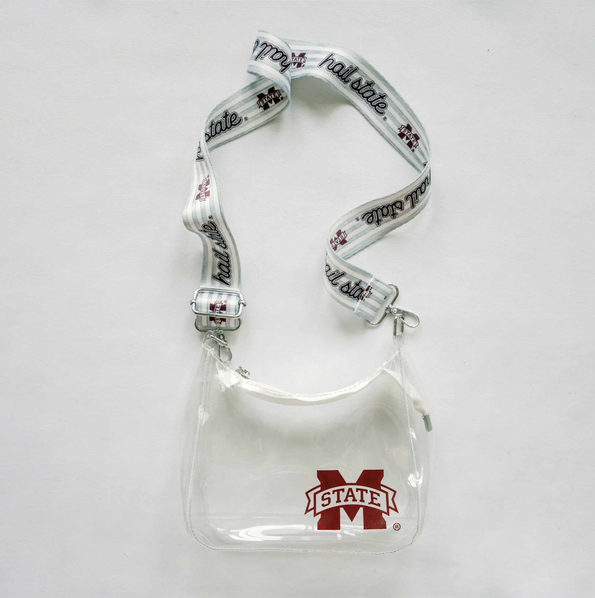 Cheer on the Bulldogs in style with our officially licensed Mississippi State clear stadium bag. Featuring a bold State logo and a thick adjustable strap with “Hail State” lettering, this bag meets stadium regulations while adding a game day-ready touch to your outfit. Lightweight, durable, and easy to wear crossbody or on the shoulder—it's perfect for football season and beyond.tional, and stylish—it’s your new go-to for sporting events, concerts, and campus life.