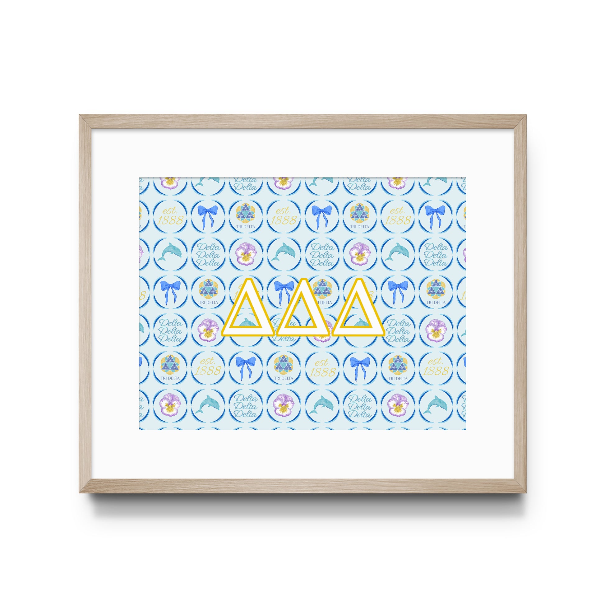 Celebrate the sisterhood of Tri Delta with this beautifully hand-illustrated art print. Featuring iconic symbols like the dolphin, pansy flower, bow, and jeweled crescent heart, each element is thoughtfully painted in soft watercolor tones. The repeating pattern highlights Tri Delta’s history with nods to “est. 1888” and the sorority name in elegant script, making it a timeless piece for any member’s dorm, apartment, or sorority house. Perfect for gifting or decorating, this print blends tradition and artistry in a fresh, modern way.